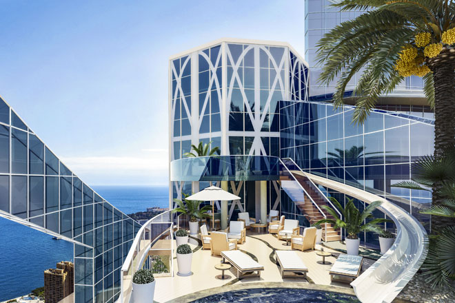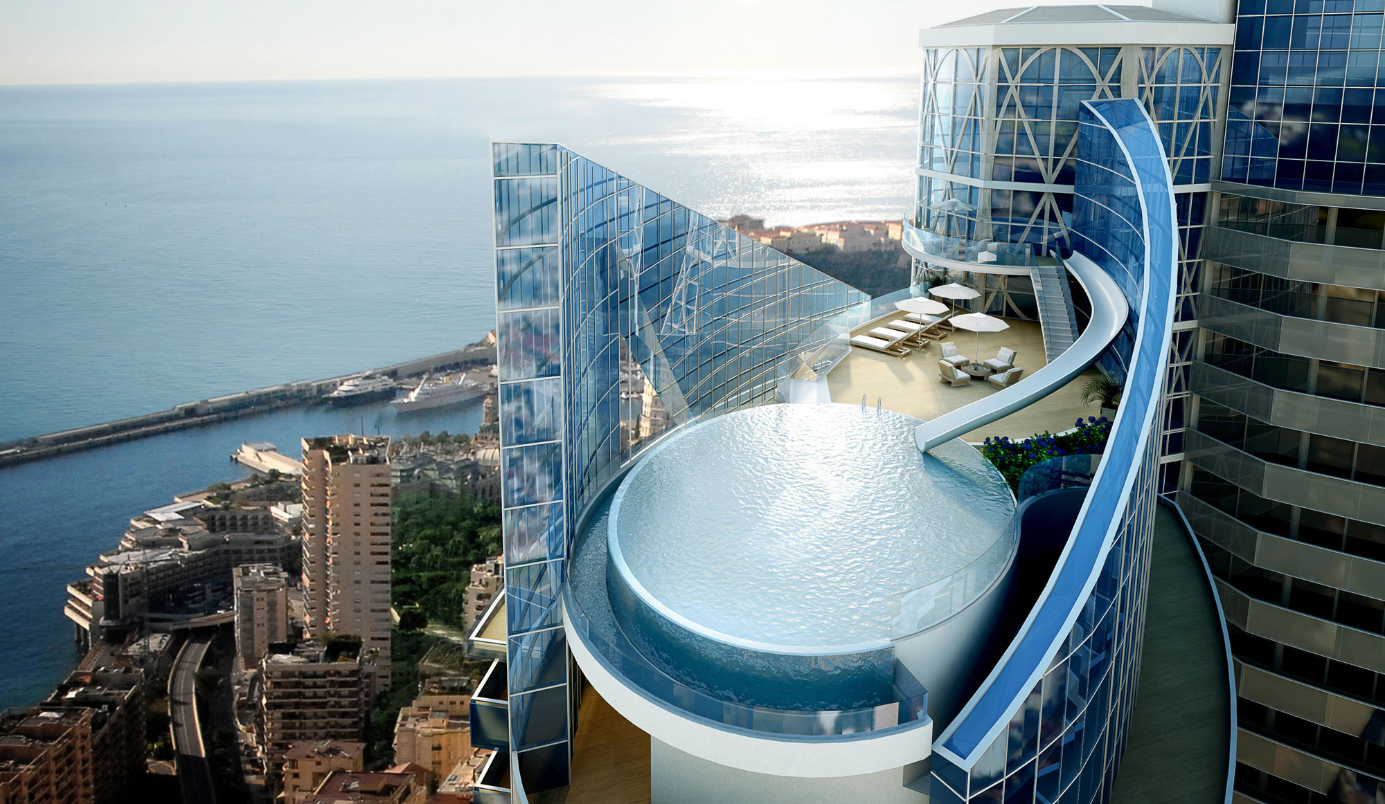 For a small, beautiful, stunning penthouse suite of 3 300 m2 of 5 floors. No need to take some time to calculate how much per square meter it does cost. At this price, you have a wonderful panoramic view over the bay of Monaco. And a great overflowing swimming pool with an outside toboggan which comes directly from the bedroom to the fresh morning water. Of course, all luxury services are available, like conciergerie, valet, shuttle and so on.