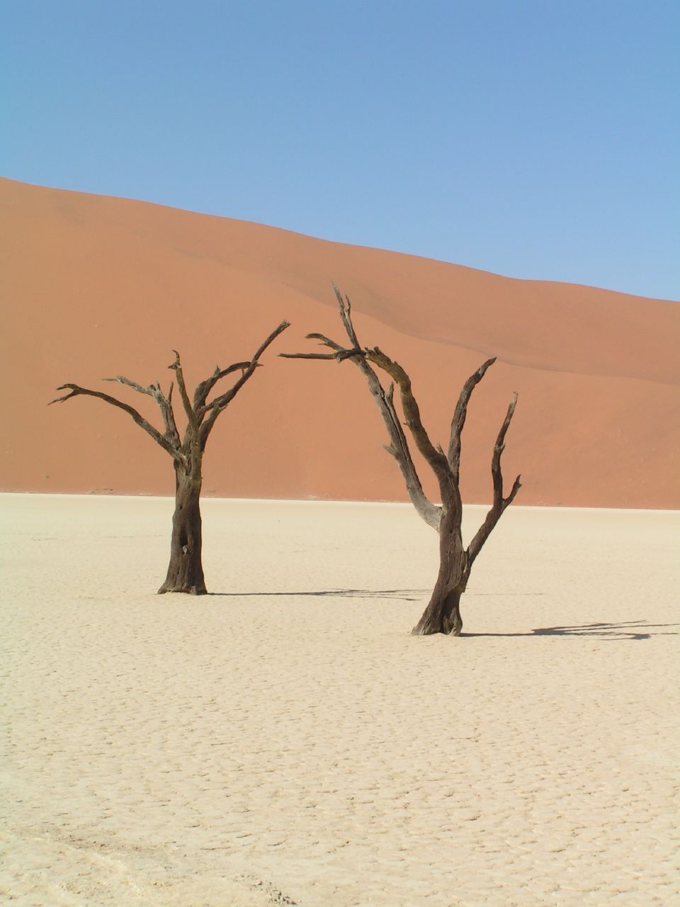 Sossusvlei is a dry salt and clay pan in the middle of the sand dunes. Beautiful, and a place to visit. The dunes around are the tallest in the world, rising up to more than 300 meters above the desert floor!